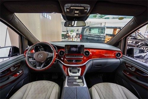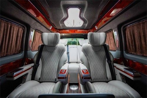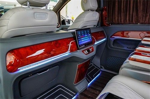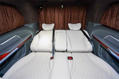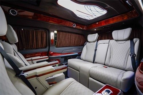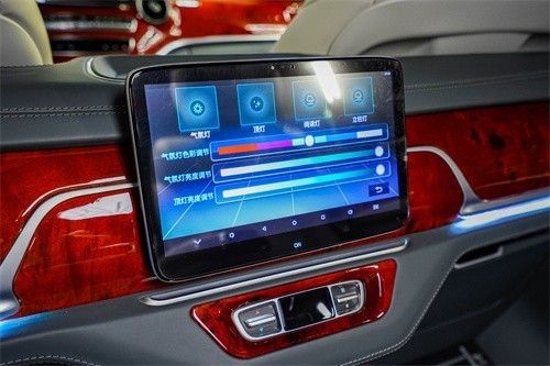 车内采用的是半隔断的设计,前后仓用一个吧台分割开来,吧台处内嵌式的触摸屏调节车内灯光电器等等功能,集成式的电路设计更加安全更加快捷,下方电动开合的储物盒以及两方的储物盒都让我们的重要物品有了更好的放置空间, 顶部宽屏娱乐系统更是让我们在路途中有很好的娱乐体验。
