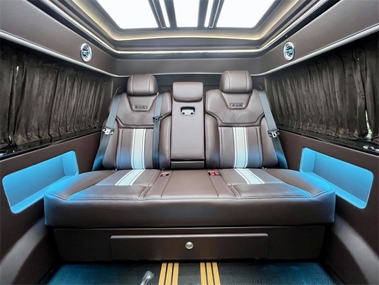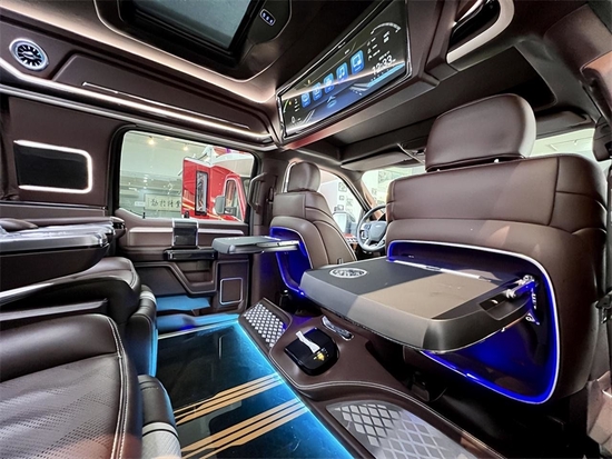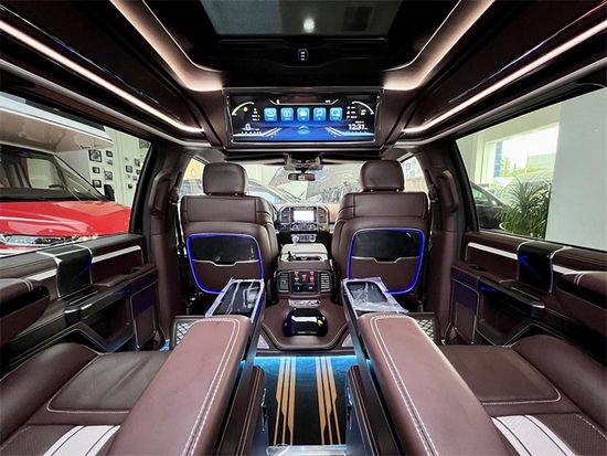 乘客舱配备折叠办公小桌板,碳纤维装饰条,独立的后排控制按钮,空气净化器,高密度超纤材料地板;顶部搭载了半隔断的车载无线网络电视机,全车10个进口BO音响系统,再配合顶部天窗和后部的三色宫格顶灯相结合,搭配整车的线条式氛围灯,凸显整车的层次感,也烘托了整体的氛围。