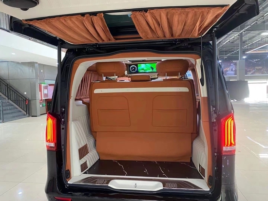 22款奔驰迈巴赫VS980商务车让人震撼的就是它的后排了,后排主座座椅为带电动、加热、按摩、通风,脚托功能的航空级首长席,可沿着地面上滑轨实现一键电动式前后滑动,然后就是非常贴心的隐藏式航空小桌板,让您办公或者休闲娱乐都随心所欲。