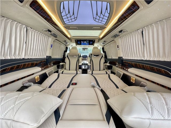 奔驰V260L自带空气悬挂,大大提高了乘车舒适性,变速箱升级为九速手自一体。新款奔驰V260L高顶车型,内饰都经过改装,其风格也是千变万化,不尽相同。今天我给大家推荐一台米色内饰的高顶V260L,看能不能在炎炎夏日里给大家带来一丝清凉。