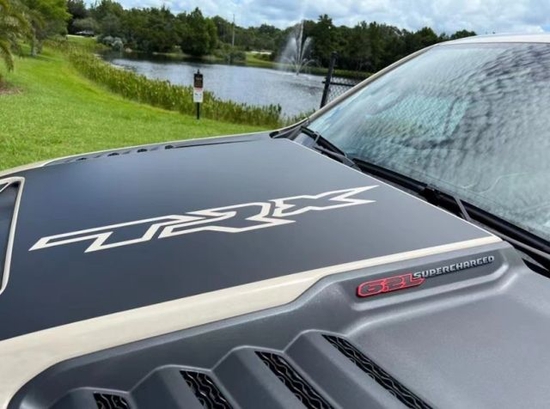 2022款道奇公羊霸王龙传承了道奇Ram家族高大威猛的造型设计,同时细节部分融入了更多高性能元素,包括经过黑化处理的前格栅,引擎盖两侧的黑色进气口,以及为了容纳巨大的机械增压器而设计的通风口等等。此外,新车还配备了视觉冲击力更强的黑色轮眉和外露式的拖车钩,看上去十分霸气。