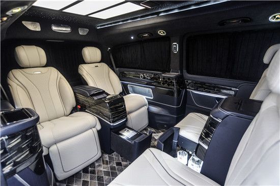 内饰风格依旧保持奔驰商务车的豪华质地,座椅均由进口澳洲小牛皮包覆,全车豪华柚木与乌木装饰--至臻奢华。高档电动调节对开天鹅绒窗帘充分保护隐私,进口意大利阿尔坎塔拉麂皮绒顶尽显品质。吧台为隐藏式座椅,可根据用车需求一键开合,收起时就会变成豪华吧台,科技感十足!车内更配有私人保险柜。