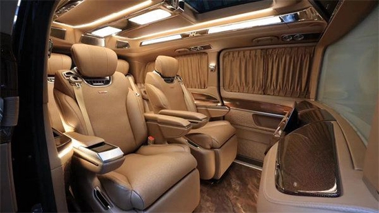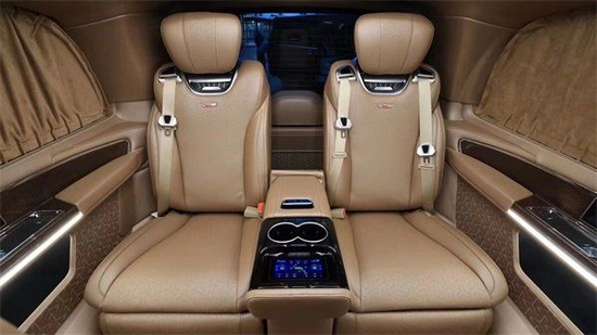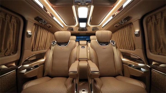 定制的黑曜石纹理地板,拥有海洋一样的蓝色和魅力,经过麂皮绒包裹的顶棚细腻精致,电动开合大天窗以及可以满足不同需求的灯组,让车内的灯光氛围可以根据需求进行改变,无论是查阅资料,签署文件或者是阅读都可以拥有最适合的灯光相伴。后舱与驾驶舱通过隔断完全隔开,隔断处有碳纤维材质的储物格,中央屏幕为整车控制区域。顶部还配备互联网液晶电视。中间部分则是一块升降玻璃,可以随时保障后舱的隐私,并且还带有雾化的功能。