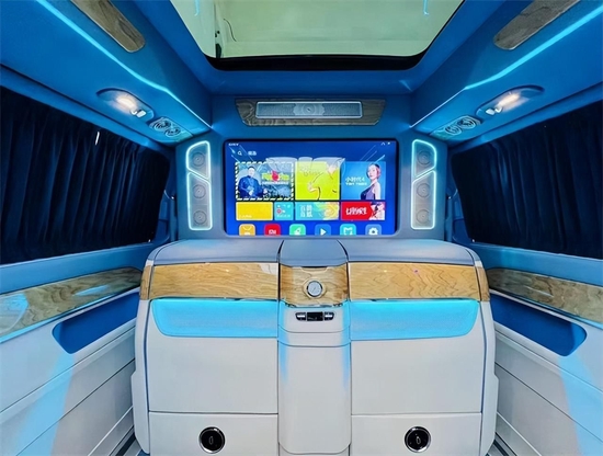 前后舱一键升降隔断搭载40寸互联网高清娱乐电视5.1环绕式声道立体音响,给您在旅途中带来一场视听盛宴。除此之外整车还配有三层隔音双层窗帘一键升降隔断,将您的出行隐私感拉到最满!在休闲娱乐凯旋而归的旅途中又怎么能不喝一杯呢?智能酒柜让您随时随地品尝美酒。