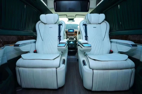 奔驰V250乘客舱前排首长级多功用按摩座椅带脚托,规划了滑轨,可自由电动移动和缩短,适应多种身高、体型的乘客,多种坐姿任君挑选,将舒适惬意延伸到车内每个旮旯。娱乐影音装备齐全,吸顶高清液晶电视,需求时可以往下翻,按钮一按,最新热点、时髦资讯随时把握。