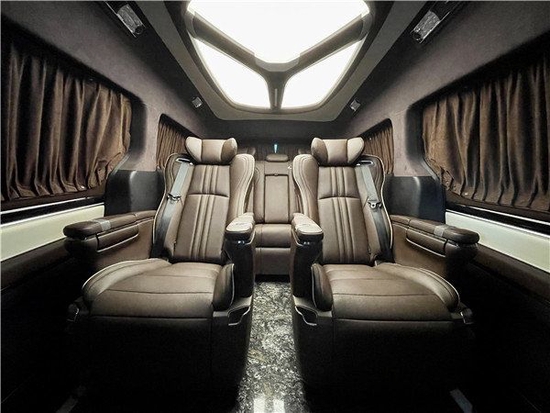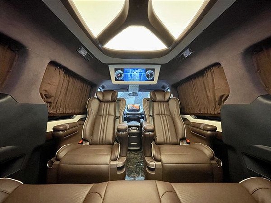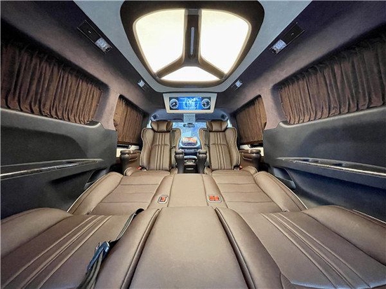后排还配备有高清宽幅网络电视以及麂皮绒制作的高级私密窗帘,像是一个移动的小型私人影院,旅行途中再也不无聊啦!商务接待的时候,还可以循环播放公司的宣传片,是一个绝好的展示公司形象,加深客户了解的机会哦!