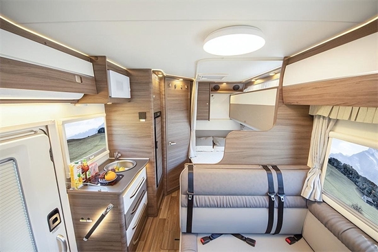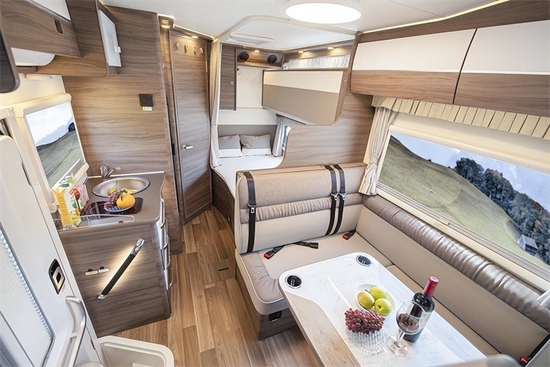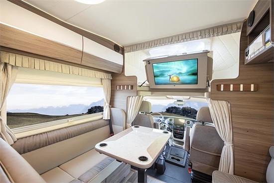 新车内部设计采用浅木色加米白的配色,温馨精致。家具采用E0级轻质环保板材+高级皮料,更添高级质感。布局清晰,前方为驾驶室、额头床,中部为会客区、厨房区,尾部为休息区、卫生间区域。得益于顶部的曲面全景天窗,额头床的光线极佳,不用担心有逼仄之感。额头床尺寸为2100×1170mm,可供双人休憩。额头床下方配有32寸小米高清液晶电视,加上车载游艇级喇叭,可为乘客在旅途中带来高级视听享受。