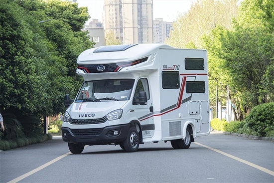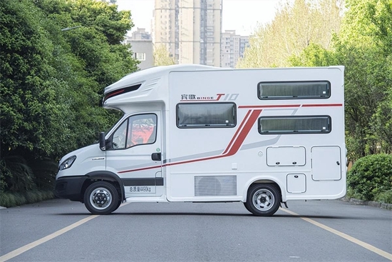 车身采用了三明治结构箱体,133全2195铝6679合金骨架更加的轻量化,宾歌系列独家中额头设计圆滑美观,一定程度上降低了车身风阻。全车采用了免胶工艺,不用担心外车胶变黄、变脏、开裂情况出现。并且,这款车采用数据化、模块化,模具成型,分片装配,后期可单片替换。外观方面,车身以白色为主,辅以红黑的个性拉花,十分耐看。整车尺寸为5980*2445*3095mm,轴距为3300mm,不到6m的车身,蓝牌C照即可驾驶。车辆基于依维柯欧胜房车专用底盘打造,配有3.0T柴油发动机,搭载进口8AT自动挡,满足国六排放标准。