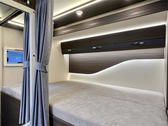 车内采用中式的家居风格,棕色木纹加米色木纹的装饰,沉稳内敛符合大多数人的审美风格,会客厅部分采用的是对座式沙发卡座的设计,直径达到了1.95m,即便两个成年人对立而坐也不会碰腿。同时把桌板上方可以在内部储存一些小工具,把桌板下方可以形成一张临时休息的区域。