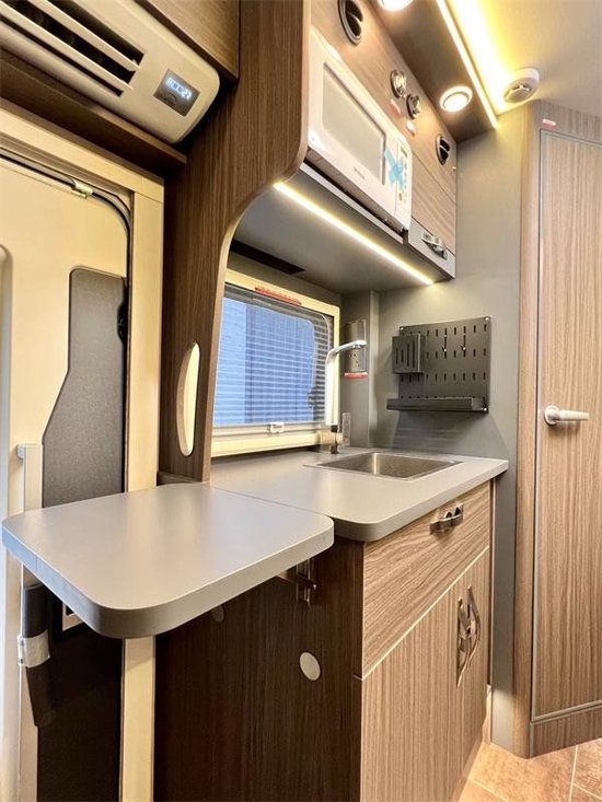 精致玉石台面配有洗菜池和米家电磁炉,上方配有微波炉,可以加热食物。下方配有多个储物抽屉及储物柜,抽屉巧妙地设计为双向抽屉,从外部也可拿取。当然,如果觉得厨艺室内的厨房不够自我发挥,还可以和外设的户外灶台配合使用。厨房区配有铁灰台面,深水槽,延伸案板,以及米家的电磁炉,上方的微波炉,可以加热食物。配合卡座后方的赛特福德152L双开门冰箱,保证旅居的食品储量。这款车还独立开发了热能回收系统,可以回收发动机余热,空调外机余热,柴油暖风余热,回收的热能可以给水箱进行加热,水不用浪费宝贵的电能再次加热可以直接用来洗澡,零下的时候可以防止水箱结冰,并且热量一直上升可以形成地暖效果,一举三得。