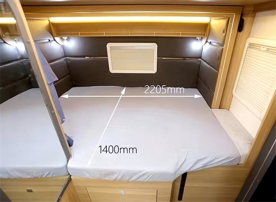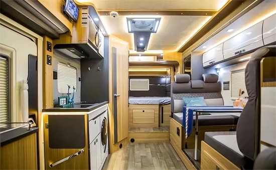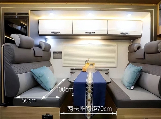 车身中部会客区有两排对坐式双人卡座沙发搭配升降桌板组成,沙发内部填充饱满,桌板侧边设计有置物凹槽,可以在行车时放置水杯避免滑落。车内常用物品可以收纳进顶部吊柜中,无需来回上下车取物。夜晚睡眠时降下桌板,可以于沙发拼成一张单人床铺,旅途中乘员较多或是有客人来访时也能有足够的睡眠空间。