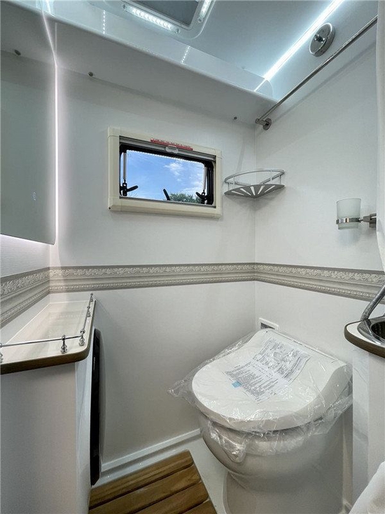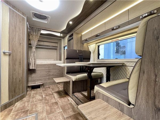 内部采用了E0级的环保板材,整车无异味,装饰看上去更为舒心;额头区配有电视以及额头床方便我们娱乐的同时又提供休息区域;没有配备天窗是为了做到极致的保温;会客厅部分采用对坐式卡座同时配有外置桌板以及衍生板凳,满足我们六人同时的吃饭;180-1775-1185