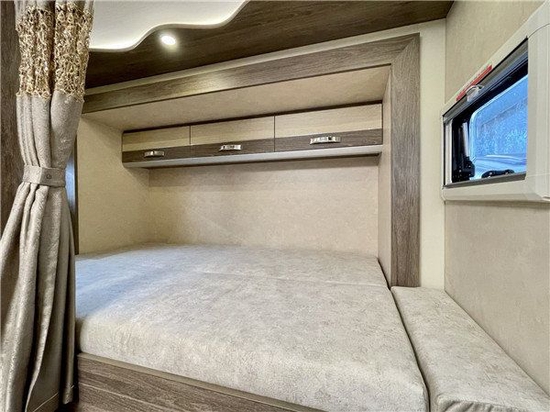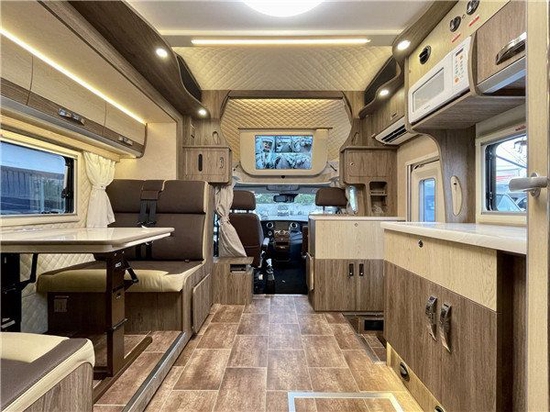 会客区由双人对坐沙发与可升降餐桌组成,日常可乘坐3-4人,夜晚则可将餐桌降下,变成一张1900X945mm的单人床位,增添房车内可休息人员的数量。搭配合适的外推车窗,在驻车休息时,可以享受微风拂面的畅爽。上方配有4个吊柜,同时我们的卡座下方也可以进行储物,再搭配我们尾部的储物仓让我们拥有近2500L的储物空间