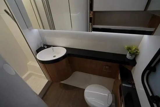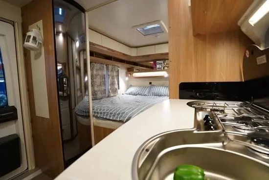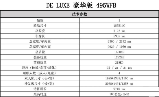 HOBBY 495的总长度(含牵引连接处)为7127mm,车身长度为5935mm,车外宽高为2300*2639mm,车内宽高为2172*1950mm,整体采用轻量化设计,总质量1500KG,可同时容纳4人起居需求。