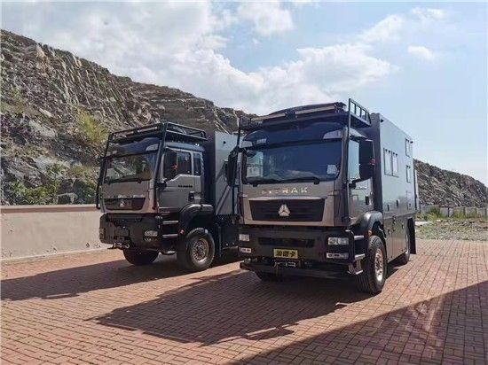 新重汽曼恩4×4重型越野房车基于重汽豪沃TX 4×4底盘打造,车身尺寸为5995×2550×3600(mm),轴距3600mm,整备质量12200kg,最大总质量13000kg,油箱容积为400L,可轻松续航1800公里;车身采用德国曼TGA柔性车架,箱体为热断桥硬化铝骨架六层加强保温结构,厚度为60mm,耐零下30度低温。越野专用方舱造型,三点悬浮设计,保证车厢稳定性的同时也防止意外变形,地板及家具异响,极大延长箱体使用寿命。底盘方面,前后悬挂采用前后专用板簧+液压筒式减震器的组合形式,其作用可过滤行驶途中的颠簸感也保证了舒适性;三把差速锁也让它对于任何路况都可从容不迫的通过,提升了户外越野的生存性。轮胎规格为425/65 R22.5。