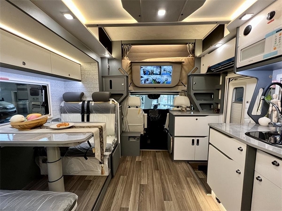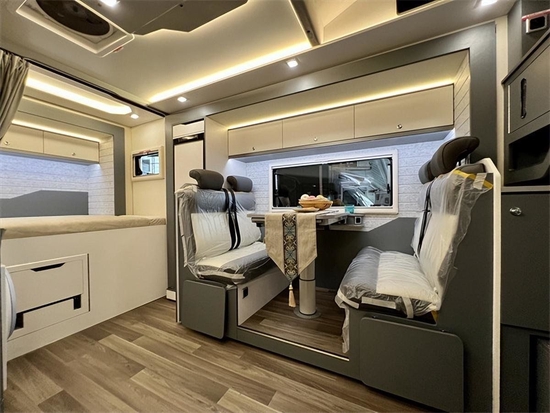 车内部分采用中式的家居风格,更符合中国人的审美,会客区采用双人对坐卡座设计,可以向外侧拓展开来,将餐桌向下可与卡座拼接变为一张1900*945(mm)的沙发床。上方设计有一组吊柜,可以放置一些物品,配合我们尾部储物仓让我们整车的储物空间达到惊人的2500L;左侧拓展出去以后中间有了一块非常宽敞的空间。内饰采用了棕色木纹加米色木纹的装饰,沉稳内敛十分讨喜。