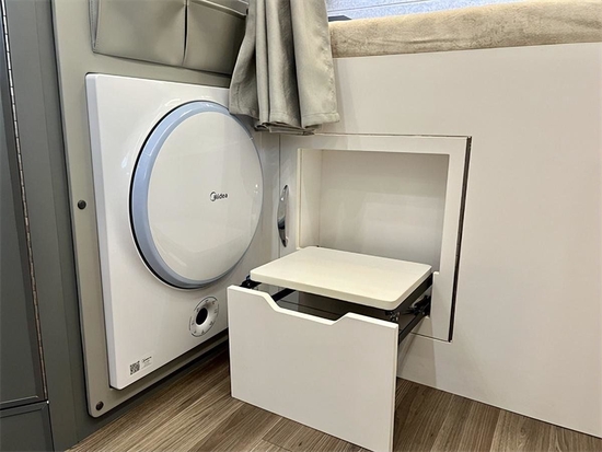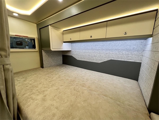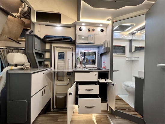 内饰和厨房区有较大的升级,厨房区T+L型厨房台面与侧翻板可以有效增加厨房区面积。洗衣机的位置也做了调整,腾出了更多的储物空间。此外,还单独设计有筷篓等小物件的收纳处,实用性大大提升。尾部床铺增加了独立的衣橱,可以保证满载6人都能拥有独立的吊柜。床铺下方的脚踏也采用了可变形设计,需要的时候可以作为换鞋凳使用。水电系统方面这款房车标配330L净水箱、48V 250Ah电池、48V 4000VA逆变器等。