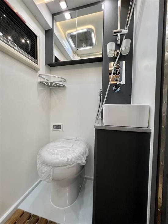 卫生间采用干湿一体式设计,地板为干湿分离式结构,可起到防滑作用。有小巧的马桶、洗手池、梳妆镜、美国进口十速MAXFAN换气扇及独立式淋浴花洒等。