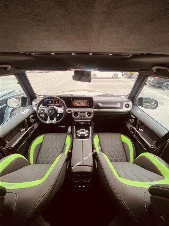 2022款奔驰G级AMG G 63车内越野气息十足,多处硬朗设计使其具有硬派越野车风格。采用现下流行的双连屏设计,让车内还具有一些科技感。双连屏界面显示清晰,易读性不错。方向盘为三辐式式设计,除了常见的功能按键区域之外,还在下方加设了一些按钮,驾驶仪式感十足,也可以让驾驶员专注力提升,不分神去操作其他功能。方向盘支持各种导航、电话、以及娱乐功能的控制按键。中控区域还采用了AMG车型独有的模拟时钟IWC设计,时钟中的数字和指针均采用纯金属材质,质感不错。