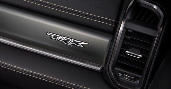 2022款道奇霸王龙的内饰部分进一步强化了其高性能版本的形象,中控台和座椅随处可见的TRX标识便是最好的例证。同时,作为道奇家族的旗舰车型,新车还配备了12英寸竖置中控屏幕,除了支持蓝牙、导航和车载Wi-Fi等常见功能,还支持Apple CarPlay和Android Auto手机映射。