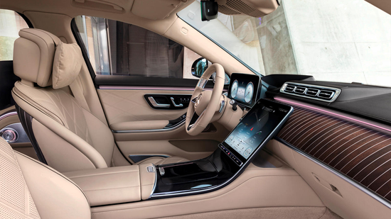 五光十色的氛围灯,配合副驾驶的游艇式的条纹面板,让这辆主打商务的迈巴赫商务气息锐减,结合三十一个扬声器的柏林之声,能让七十岁的董事长,以最快的速度勾起它五十年前在迪吧蹦迪时的峥嵘岁月,其实迈巴赫S680的主要卖点,并不仅仅是它豪里豪气的外观,极度豪华与舒适的内饰布局,才是这辆迈巴赫真正的核心部分。全新设计的方向盘,透出了厚重的金属感,仪表盘以及中控屏 也取消掉了原本的连体设计,上方的全液晶仪表盘,采用了全新的悬浮式设计,这很好的遮挡住了后面的抬头显示模块,单独分开的中控屏尺寸也达到了十九英寸,这与如今的大屏化设计趋势十分的吻合,它搭载了全新的人机交互系统,在功能性方面也是集大成者为一体。