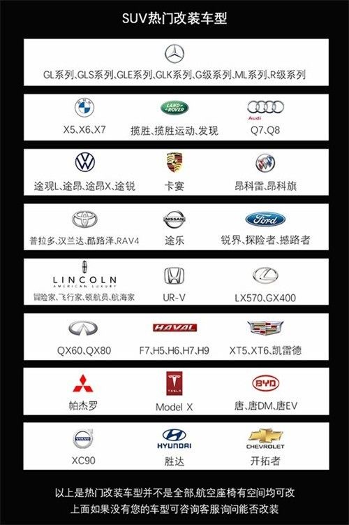 特斯拉:model y、model x。沃尔沃:XC90。蔚来ES8。理想ONE。 一般改装项目清单:航空座椅、三连座沙发、柚木地板、全隔断、带升降电视、半隔断吧台、吧台隐藏座椅、电动中门、电动尾门、导航、桃木方向盘、方向真皮包、覆仪表台真皮包覆、驾驶座真皮包覆、驾驶座电动调节、驾驶座电动加热、驾驶座电动通风、驾驶座电动按摩、驾驶座气动按摩、驾驶座加棉、驾驶舱鹿皮顶、后舱鹿皮顶