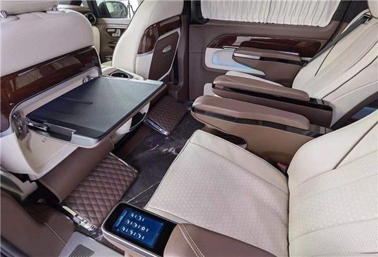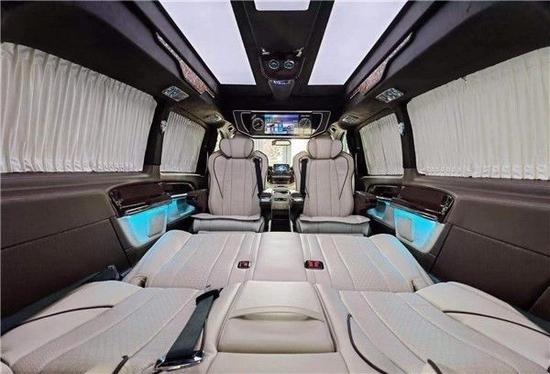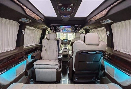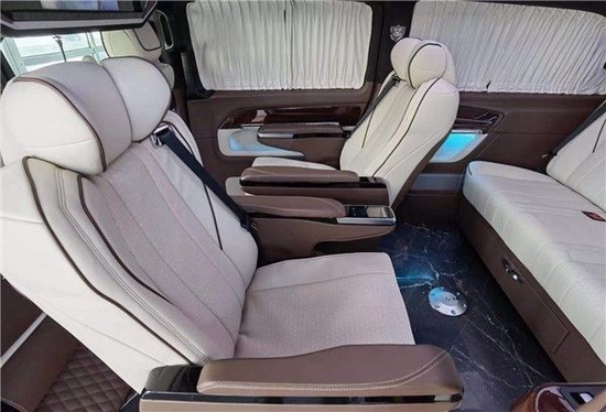 奔驰V250版以下是贵宾舱二个总裁座椅,这二个座椅具有记忆功能,何为记忆功能呢?就是一键展开及一键收回,这个座椅是根据人体工程学设计而成,能一键式找到您身体最舒适的角度。在总裁座椅双侧有两个隐藏式桌板。总裁座椅中间有个热感电子触摸屏幕可控制后舱设备,屏幕下方有个“语音控制系统”也可控制整个贵宾舱的设备。