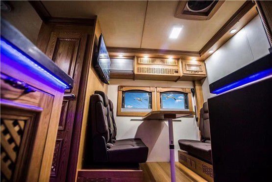 车实木(美国红橡)搭配拉丝铝板家具+环保型房车专用柚木地板革;布局方面,采用了会客区对卡座沙发+气动升降餐桌+实木组合式橱柜+卫生间+车尾横置上下床的布局结构设计,全车的储物空间非常丰富,对于长期户外旅游者来说实用性高。暖色系氛围更贴近居家效果,让成员即使在外旅行也能感受到住家的感觉。会客区真皮软包对卡座沙发满足4人乘坐,卡座沙发搭配气动升降餐桌可变为一张沙发床;固定式安全带保护行车途中乘客的人身安全。坐垫厚实,弧形靠背也提供一定的支持感,整体来说乘坐舒适感还是不错的;沙发内侧墙壁2个独立外推窗,提供采光及通风换气效果;三菱重工变频空调(单冷)制冷效果快,可手动调节温度;吊柜方便日常收纳物品。