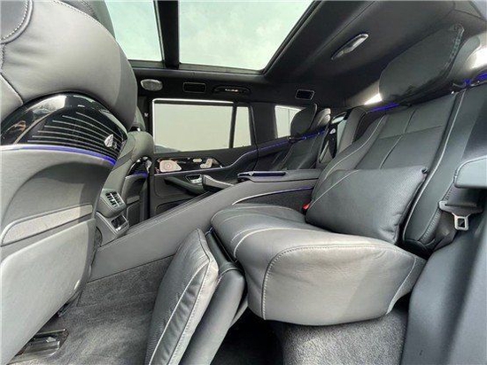迈巴赫GLS600后排带有全景天窗、独立的多媒体娱乐系统、独立分区空调,车内香氛装置,可选车载冰箱、后排小桌板。整车都是夹层玻璃,搭配整车降噪组件隔音非常好,车内带64色氛围灯,26喇叭的柏林之声音响系统。