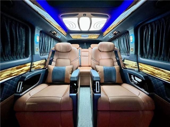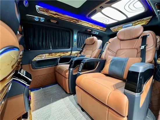 内饰采用迈巴赫亚麻棕搭配,清新靓丽,上车看到这颜色会让人心旷神怡,商务车注重的不就是后舱的舒适性嘛!两张第四代航空座椅,迈巴赫同款环抱式座椅,扶手下方进行物理按键调节角度,按摩,加热,通风,旋转等个性化功能也是具备。钻石切割造型的顶灯,极具艺术气息,满足车内照明条件的同时又添加一丝浪漫气息。