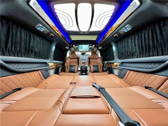 第三排支持180放平成床;再加上第二排座椅旋转形成的布局,完全就是一个豪华办公室,再加上立体环绕的音响系统,半隔断高清互联网液晶电视,两侧个性化定制的侧墙在车内进行商务洽谈也不会显得沉闷。为车内人员提供一个非常舒适、私密的休息环境。