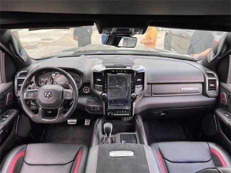 22款道奇公羊霸王龙TRX在内饰部分进一步强化了其高性能版本的形象,中控台和座椅随处可见的TRX标识便是最好的例证。同时,作为道奇Ram家族的旗舰车型,新车还配备了12英寸竖置中控屏幕,除了支持蓝牙、导航和车载Wi-Fi等常见功能,还支持Apple CarPlay和Android Auto手机映射。