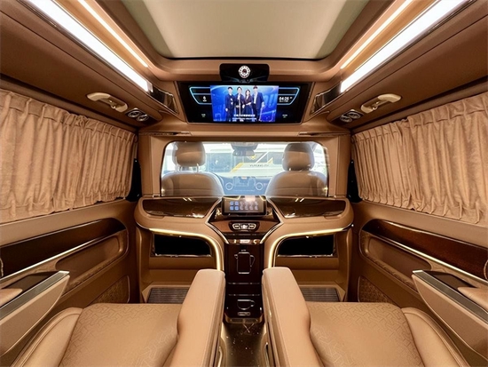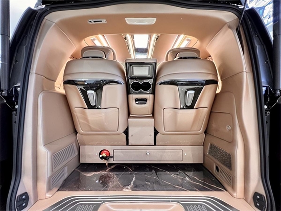 隔断整合了电视、音响、车速表、时钟、雾化玻璃隔断、热水壶、后舱气候调节开关,合理的储物空间,连脚踏都设计成了储物盒方便放拖鞋灯小物件;奔驰后仓CAN总线集成控制系统,管控后舱所有电器。中排使用第四代航空座椅,触摸屏控制,一键调节坐姿,带有通风、加热、按摩、旋转、有线充电、无线充电功能;半导体制冷不用等到车内凉爽就能吹出凉爽的冷风,颈部还带有空气围脖风口。