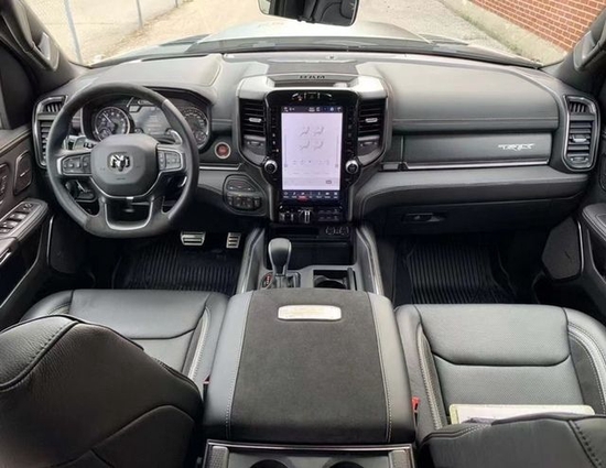 2022款道奇霸王龙内饰部分进一步强化了其高性能版本的形象,中控台和座椅随处可见的TRX标识便是最好的例证。同时,作为道奇家族的旗舰车型,新车还配备了12英寸竖置中控屏幕,除了支持蓝牙、导航和车载Wi-Fi等常见功能,还支持Apple CarPlay和Android Auto手机映射。