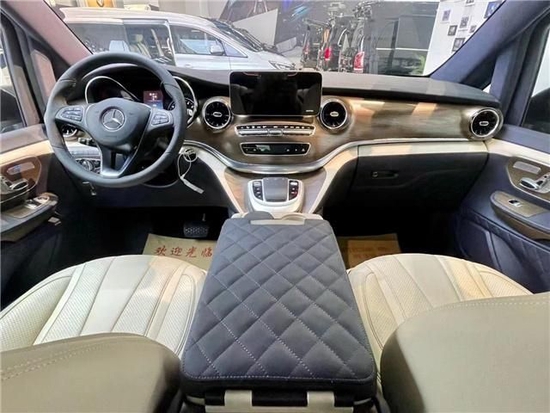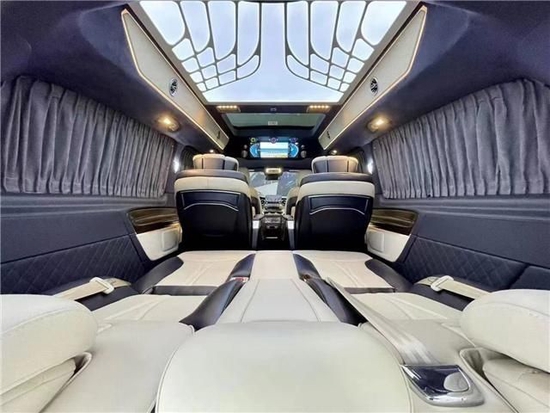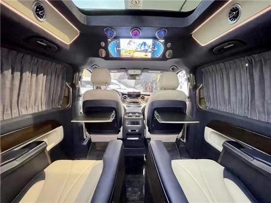 巴塞罗娜奔驰商务车中排座椅转过来后可以形成小型会议室布局,中间有张隐藏式办公桌板瞬间满足会议使用需求,在平时还可以拼成一张简单双人床,这样也可以满足不同人群在旅途中休息需要,这是一款多功能商务房车,车辆上半部分配有进口阿尔坎塔拉皮绒,整体效果更加清新,时尚。