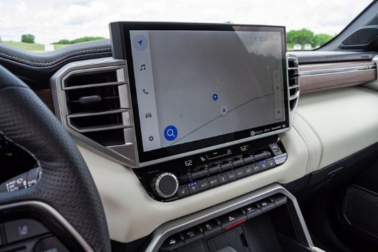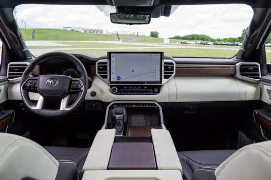 丰田红杉5700采用了金属装饰条及桃木装饰的点缀也为整车增添了几分豪华感,不足的是车内部分做工和用料方面略为稍逊,可能由于红杉产地是美国的缘故,真皮方面盘上下两段分别采用了桃木材质,握感不错,并且带有电动四向调节,其中多功能按键分布在方向盘左右两侧,诸如音量调节、语音通话、电话接听等功能都可以通过快捷链来操作完成。