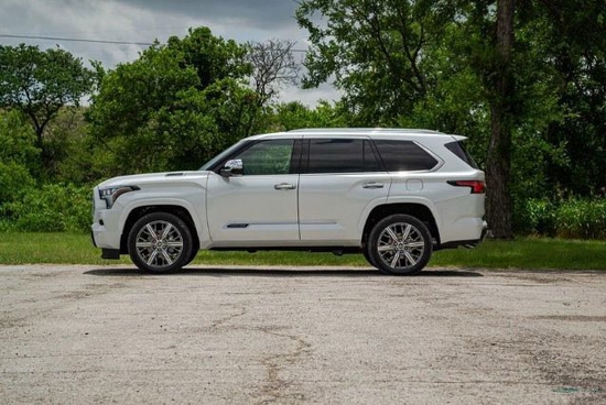 22款新款丰田红杉5700的“大”是相当惊人的,作为一款长度超过5米、宽度超过2米、轴距超过3米、高度接1.9米的全尺寸SUV即使是陆巡和大G (配置|询价)(配置|询价)停在它面前,也只会看着像小弟,来到红杉的尾部,“大”的感觉仍然在继续,尾灯由4个大圆圈组成,后备箱门的尺寸也很大。