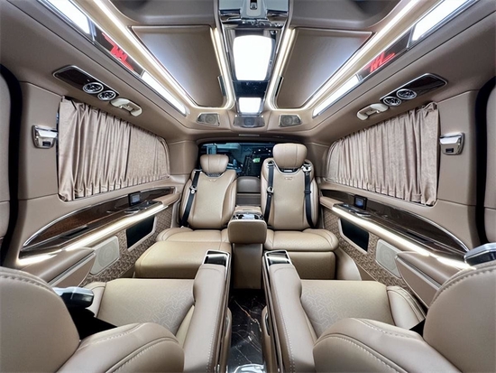 隔断整合了电视、音响、车速表、时钟、雾化玻璃隔断、热水壶、后舱气候调节开关,合理的储物空间,连脚踏都设计成了储物盒方便放拖鞋灯小物件;奔驰后仓CAN总线集成控制系统,管控后舱所有电器。中排使用第四代航空座椅,触摸屏控制,一键调节坐姿,带有通风、加热、按摩、旋转、有线充电、无线充电功能;半导体制冷不用等到车内凉爽就能吹出凉爽的冷风,颈部还带有空气围脖风口。