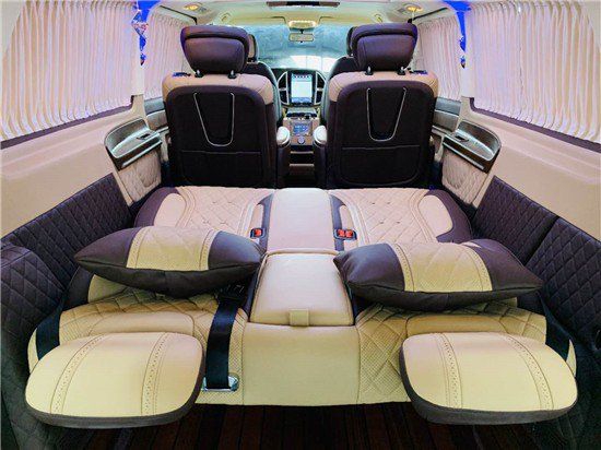 奔驰威霆改装无隔断七座商务车第二排座椅采用两个62S首长级座椅,带加热,按摩,通风,一键式电动调节记忆等功能。奔驰威霆改装七座无隔断座椅符合人体工程学设计,同时带有电动椅背调节,电动头枕,电动前后调节,180°旋转,一键式伸缩腿托功能,带来头等舱级舒适体验,,私家客厅级后舱体验,180°旋转后可以与第三排电动沙发床进行无缝拼接,满足两个成年人一个小孩的正常休息,带来卧室级舒适享受。