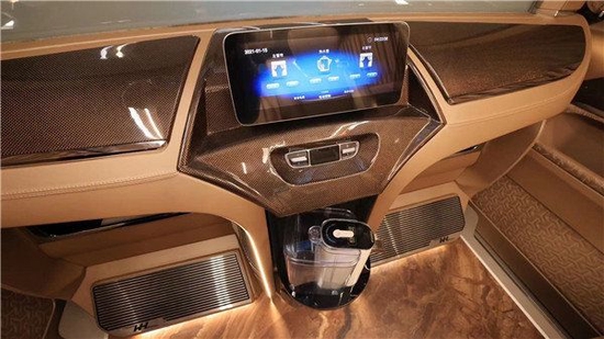 乘坐舒适性和安全性是同类车型里最高的,车辆配有一个全景天窗,可满足不同乘客使用需求,带有雨量感应等功能,雨天可自动关闭天窗。,触控屏除了可调节座椅还可控制车内顶部灯光、氛围灯、电视、空气净化器以及电动窗帘。后车舱多功能空间,全车皮质手工包覆,仿大理石高级耐磨地板,玫瑰金饰件,顶部29寸宽屏显示器,LED顶灯、环绕灯带;C柱装饰LED壁灯,中门及后排遮光窗帘等等。