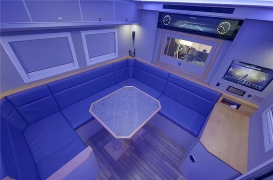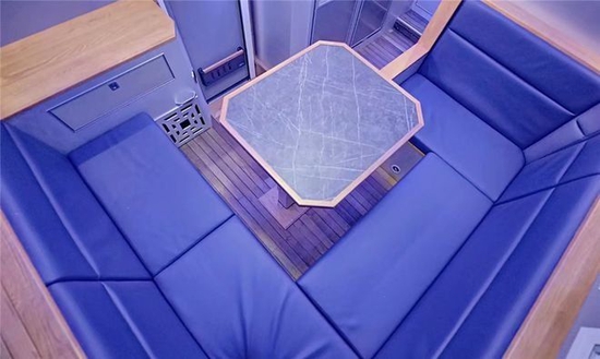 会客区真皮软包唤醒沙发布局,满足多人乘坐,卡座沙发搭配气动升降餐桌可变为一张沙发床;固定式安全带保护行车途中乘客的人身安全。坐垫厚实,弧形靠背也提供一定的支持感,整体来说乘坐舒适感还是不错的;沙发内侧墙壁2个独立外推窗,提供采光及通风换气效果;三菱重工变频空调(单冷)制冷效果快,可手动调节温度;吊柜方便日常收纳物品。