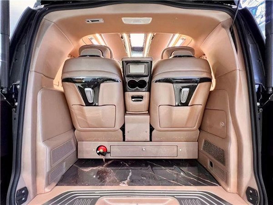 打开电动中门,隔断处设计了隐藏式的雨伞架,和劳斯莱斯雨伞的存放方式异曲同工之妙;高光泽电镀的迎宾踏板,让上车更有仪式感;定制的大理石纹的蜂窝铝地板,隔音降噪耐磨抗划痕,比地毯更易打理,不易滋生细菌病毒。180-1775-1185