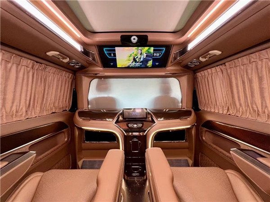 内饰的定制,也是这款奔驰V级 (配置|询价)改款的重头戏。跟原车不同的是,这款V级采用纯色的内饰搭配,一体式的中控台采用高密度碳纤维材料包覆,新增了大容量车载冰箱。细腻的缝线加上打孔真皮包覆的座椅,整体驾驶舱很有迈巴赫S级 (配置|询价)那味。
