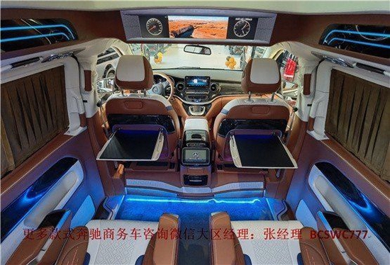 奔驰V260L版以下是贵宾舱二个总裁座椅,这二个座椅具有记忆功能,何为记忆功能呢?就是一键展开及一键收回,这个座椅是根据人体工程学设计而成,能一键式找到您身体最舒适的角度。在总裁座椅双侧有两个隐藏式桌板。总裁座椅中间有个热感电子触摸屏幕可控制后舱设备,屏幕下方有个“语音控制系统”也可控制整个贵宾舱的设备。