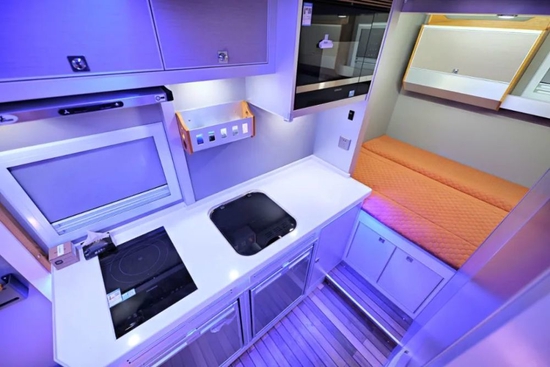 厨房设施方面,整车配有西门子电磁炉、西门子微波炉、进口塞特福德专用带盖水槽+折叠水龙头、进口房车专用抽油烟机、调料架、储物柜、电源插座等设施,还有超大的橱柜台面便于料理食材。