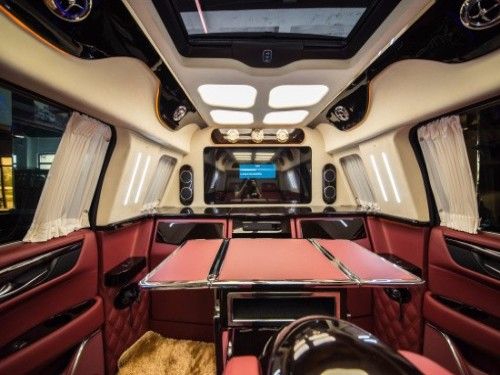 凯迪拉克总统一号躲藏六座商务车内饰部分:舱内间隔:可升降分隔屏,32寸超薄液晶电视 音响设备:BOSS盘绕音响,DVD 舱内灯饰:氛围灯 LED灯饰,迈巴赫棚顶灯 舱内吧台:酒柜 咖啡机舱内桌板:电动躲藏式伸缩桌板地板材质:柚木地板 舱内天窗:全景敞开式大天窗。