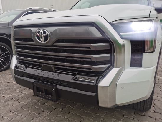 丰田坦途外观设计上,新车整体轮廓依旧给人一种高大威猛的感觉,整车均采用平直且硬朗的肌肉线条设计,不过在车辆的前脸设计上,确显的比较夸张,巨大的黑色前格栅,内部采用了横幅蜂窝中网布局,同时在周围还加入了镀铬装饰,另外两侧的日间行车灯则采用了侧“T”型造型,增加了前脸的辨识度。