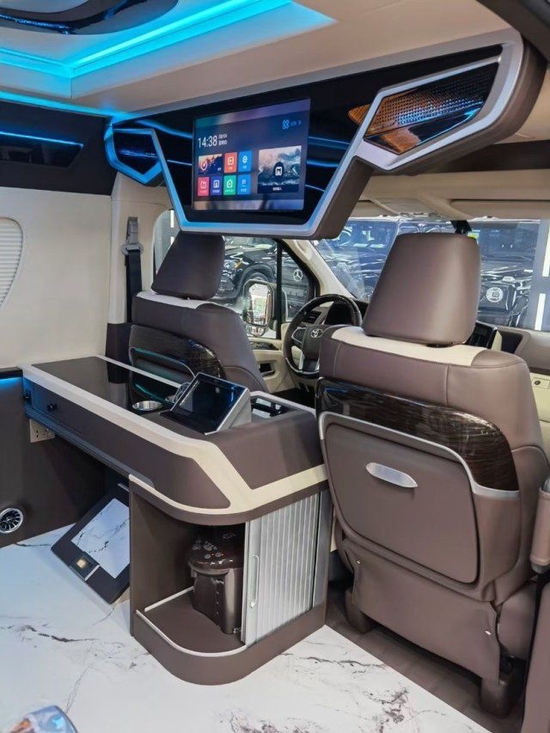 升级配置:22款丰田海狮蓝牌6座御世版 配置:电动折叠后视镜 车体包围 LED大灯 铝合金多辐轮毂 防擦条 整车镀铬套件 无线电视 飞燕顶灯 氛围灯 阅读灯 整车隔音隔热 办公桌 热水壶 高级音响 整车皮革包覆 桃木内饰 4张旋转航空座椅(触摸操控 电动调节 通风加热)主副座椅电动调节(主六副四)中央扶手冰箱 大屏导航 环车影像 隐私玻璃 铝合金踏板 电动侧门 一体式地板 折叠窗帘 壁灯 空气净化器 独立暖风 无线充电。