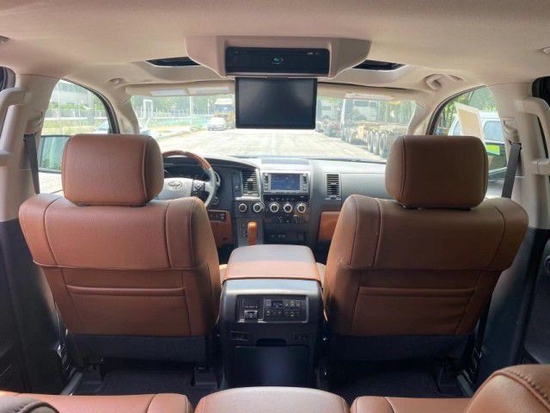 22款加版丰田红杉5700铂金版 颜色:灰/棕 配置:381马力/544牛米,七座,天窗,两驱四驱自由切换,LED大灯,LED雾灯,12气,中央差速锁,JBL音响,多种驾驶模式,雷测自动跟车,驾驶辅助包,车道偏离预警,智能卡,桃木内饰,真皮,大屏,电动多向调节带记忆座椅方向盘,低盘升降,三驱空调,前座椅加热通风,后座椅加热,二排航空坐椅,带庶阳帘,二排中央扶手,吸顶DVD,三排坐椅电动,电动后车窗,电尾门,拖车包,桃木方向盘,隐私玻璃,二三排遮阳帘,外观镀铬套件,踏板。全车镀铬