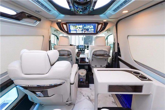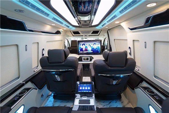 丰田(进口)海狮-HIACE驾驶舱升级9寸导航,搭配360度全车影像,红木方向盘,升级了原厂桃木纹内饰改为进口红木,豪华感顿显。主副驾驶座椅真皮包覆,主副驾驶座椅四向电动调节带通风加热,主副驾驶中间升级车载扶手冰箱。丰田(进口)海狮-HIACE主副驾驶后面,加装了24寸高清液晶电视娱乐系统,全车升级阿尔派音响系统。咨询电话在最下方